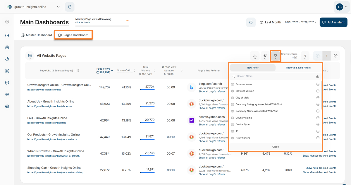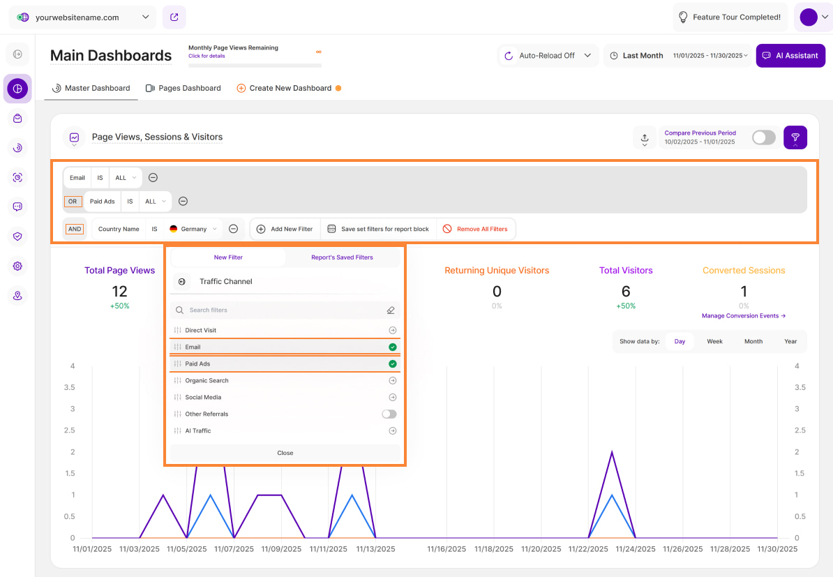 Just like the Master Dashboard, you can apply various filters to the Pages Dashboard for enhanced analysis. It now offers powerful traffic channel filters, empowering you to easily focus on specific traffic sources (like organic search, social media, or direct traffic) for a more granular analysis of your website traffic.