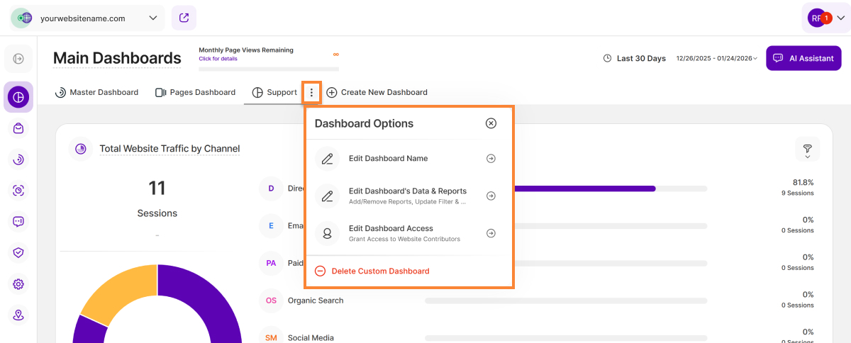 Manage your custom dashboard settings by selecting the three-dot menu, which includes the following dashboard options: