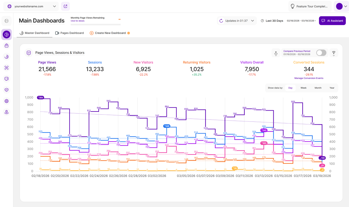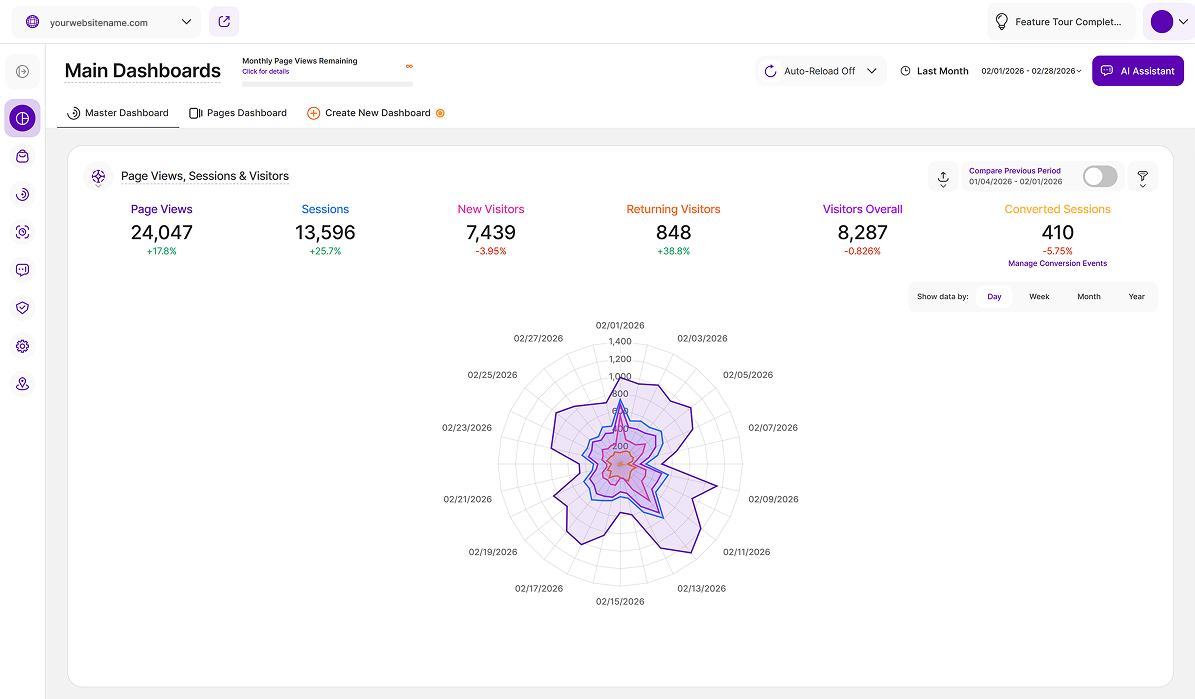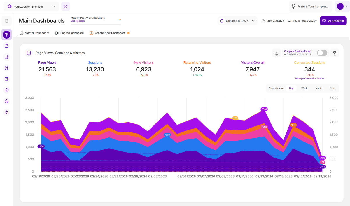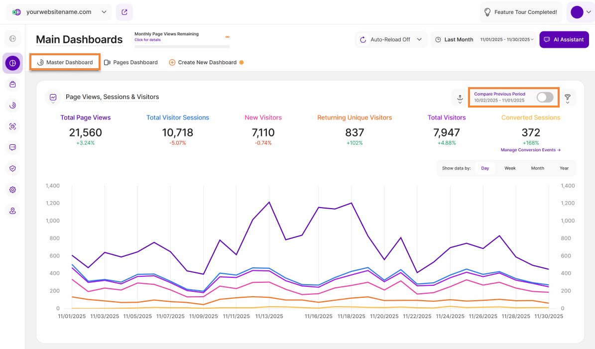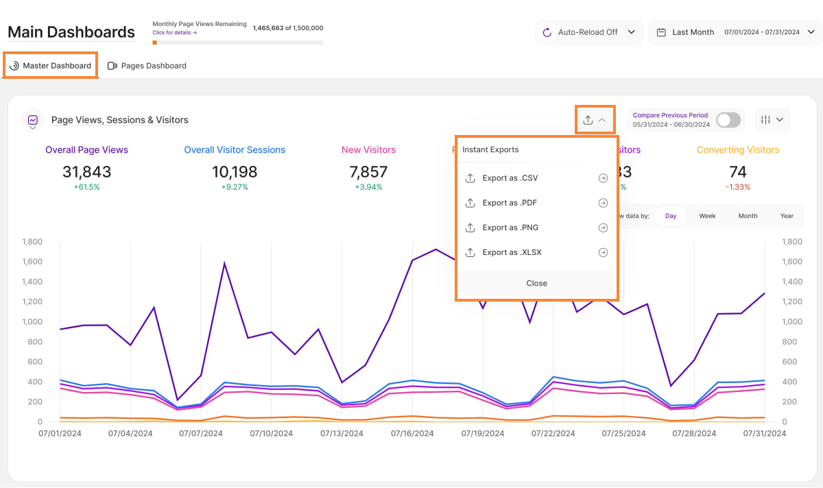 - Currently Available: This feature is currently available on the Main Visits Report Block (Page Views, Sessions & Visitors) and the Pages Dashboard. We're actively working to expand it to other report blocks soon!