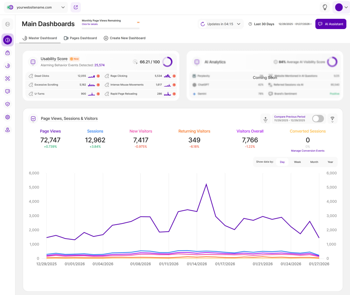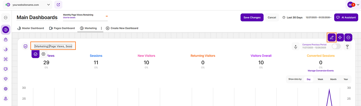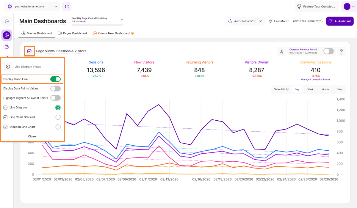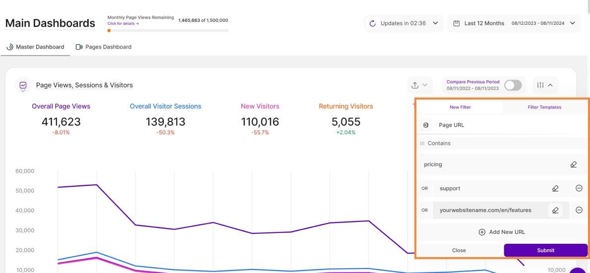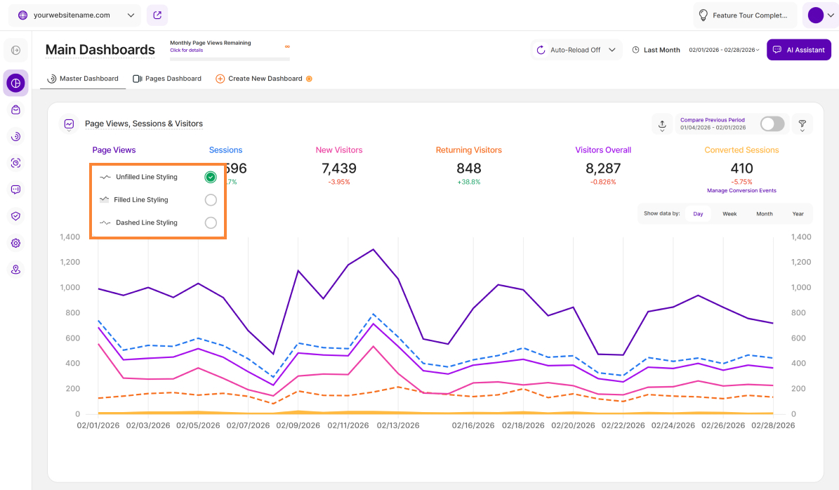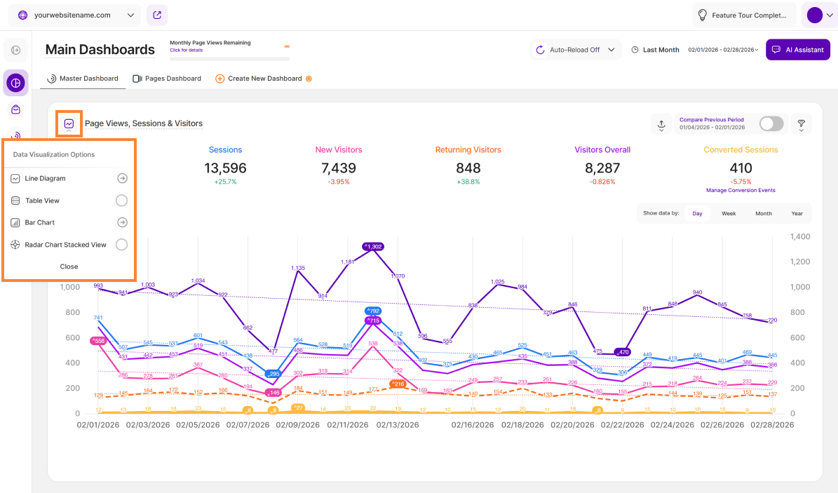 - Currently Available: This feature is currently available on the Main Visits Report Block (Page Views, Sessions & Visitors) and the Pages Dashboard. We're actively working to expand it to other report blocks soon!
