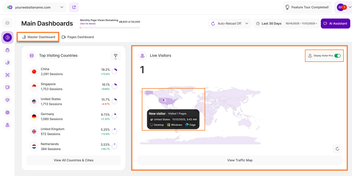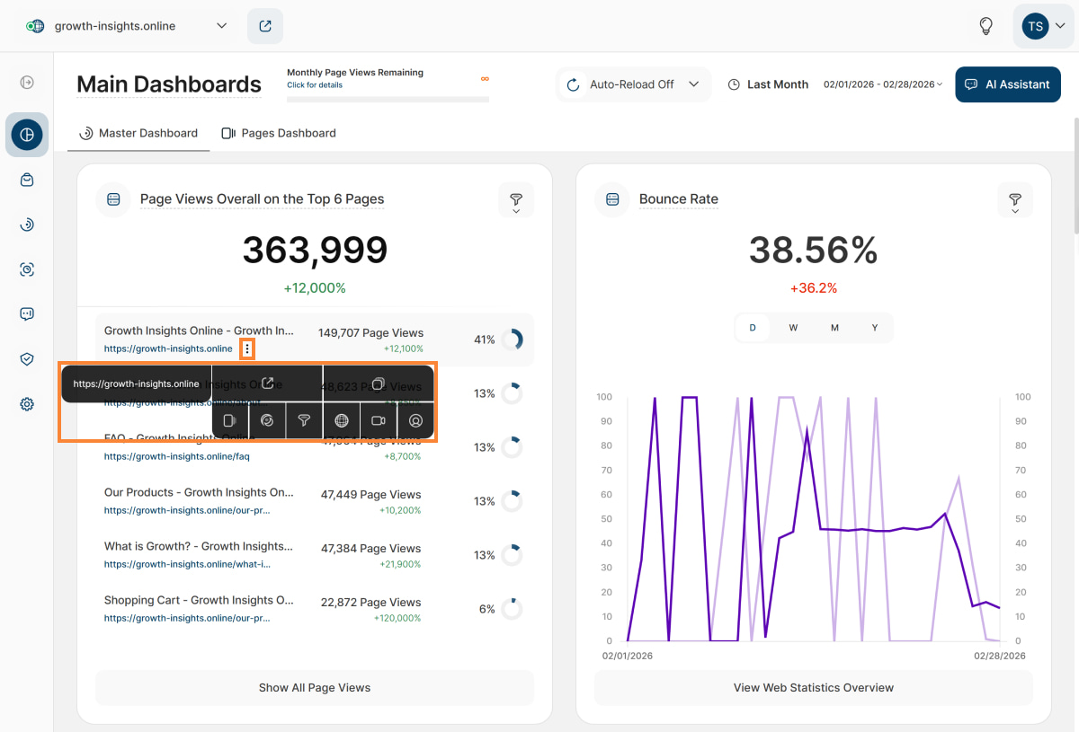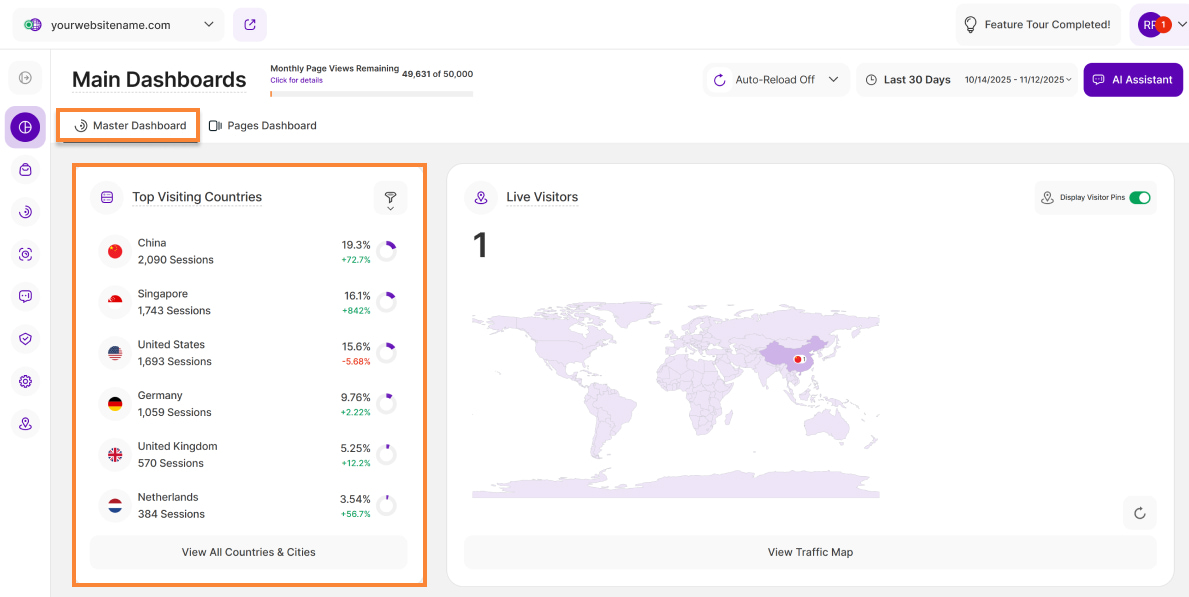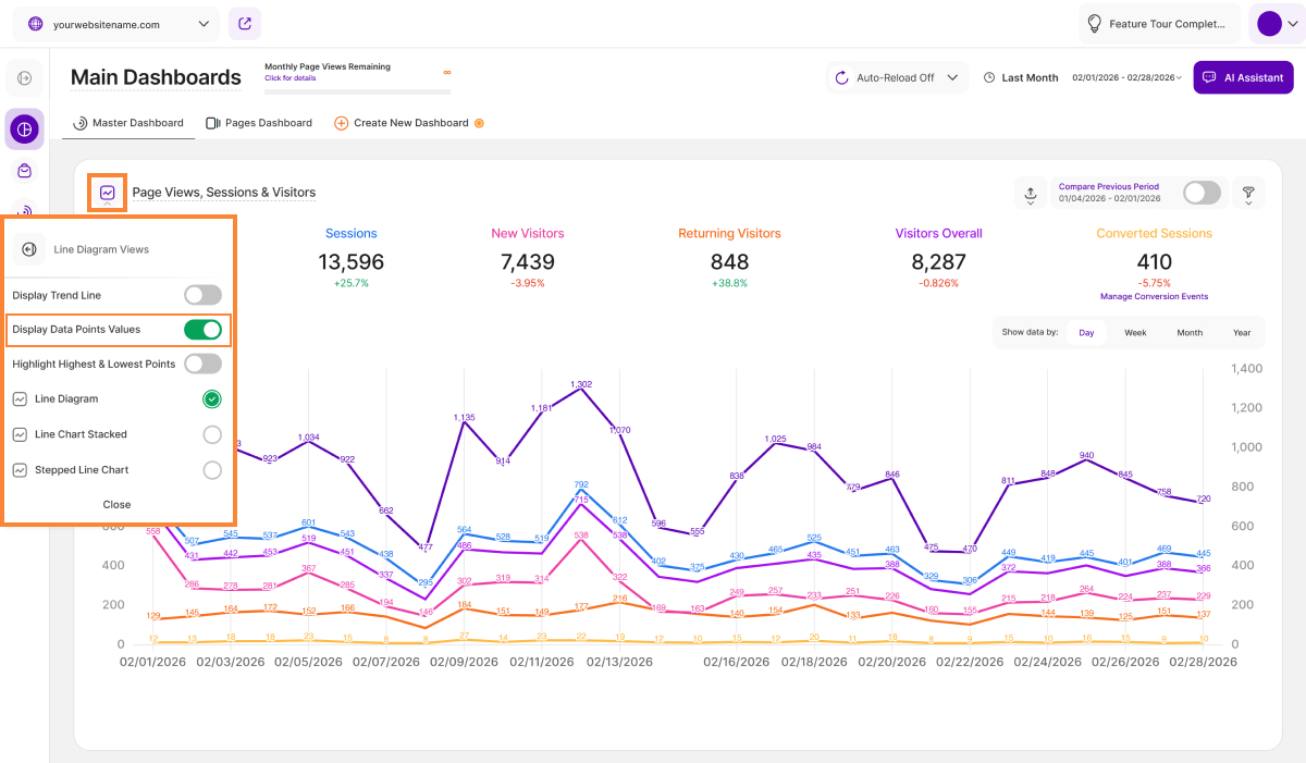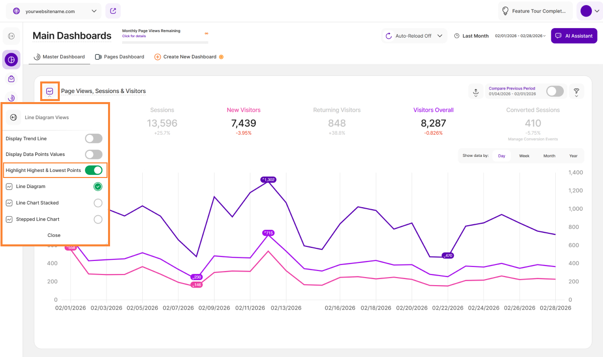 - Currently Available: This feature is currently available on the Main Visits Report Block (Page Views, Sessions & Visitors) and the Pages Dashboard. We're actively working to expand it to other report blocks soon!