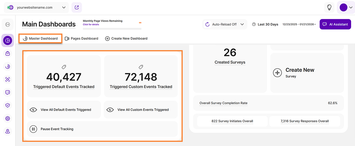 Important Note: The limit shown for trackable event triggers applies on a monthly basis. Please note that resetting your website data does not reset the counter for monthly tracked events. The counter is reset at the beginning of the next month, or immediately if you upgrade your pricing plan, which may result in potential limit increases.