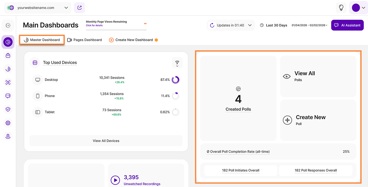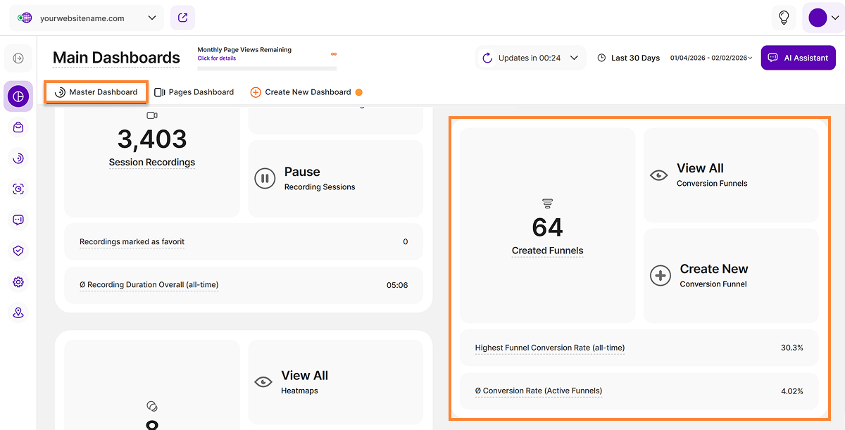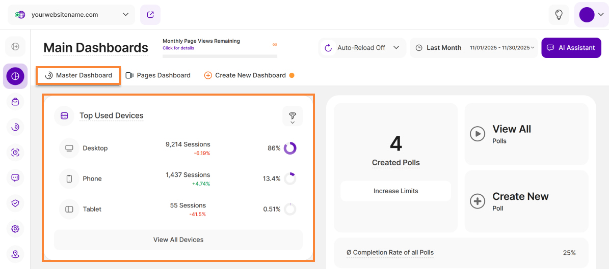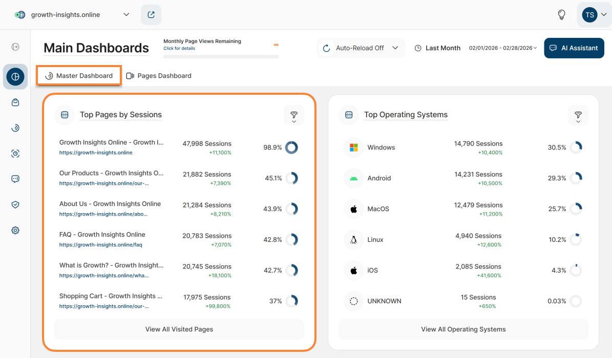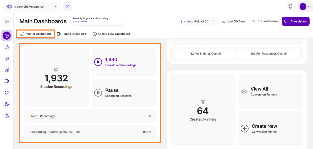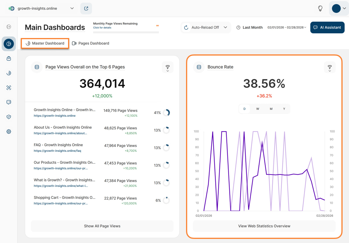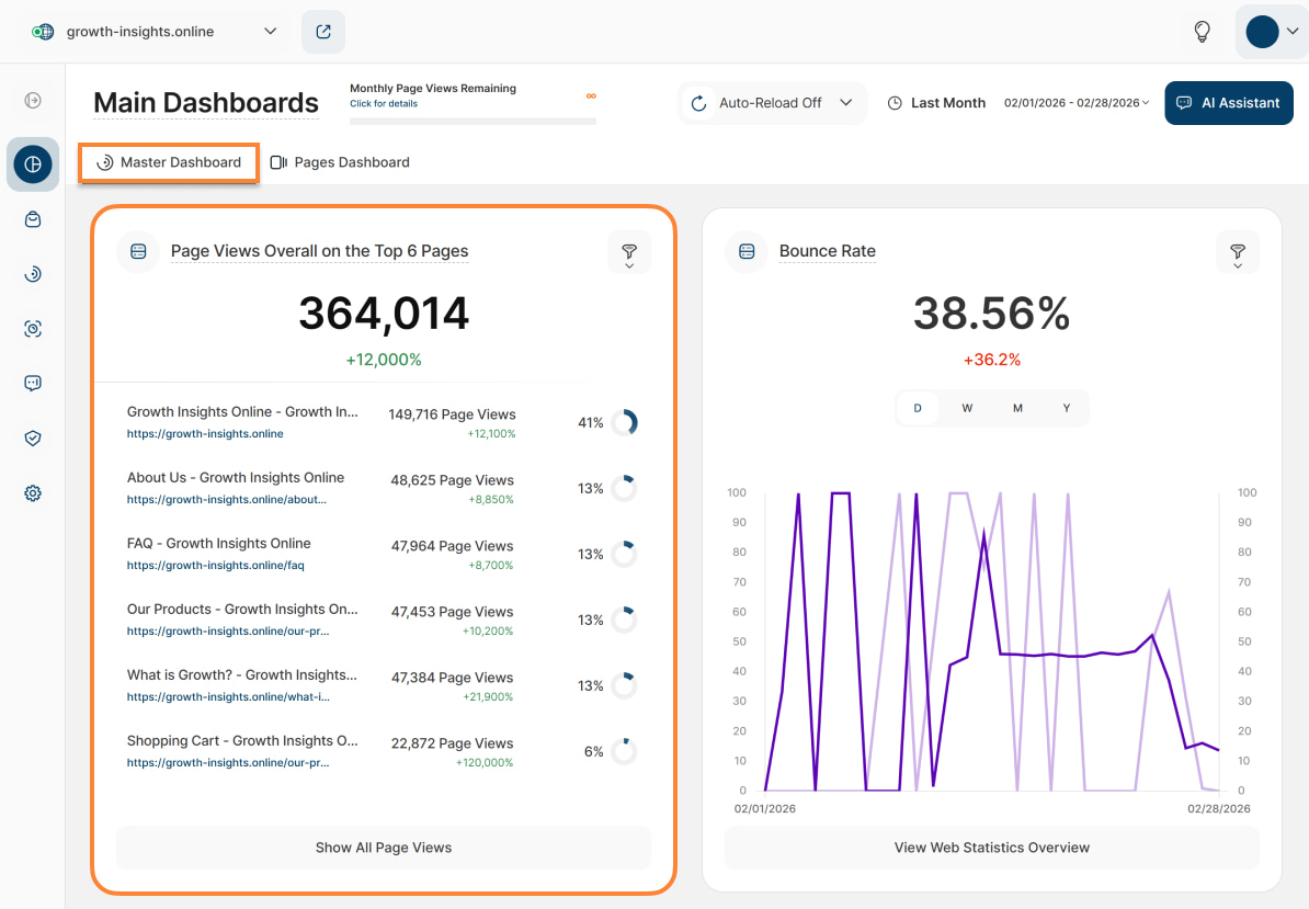 - Master Dashboard (formerly "Overview"): This section provides a quick overview of all the most important data from your website.
