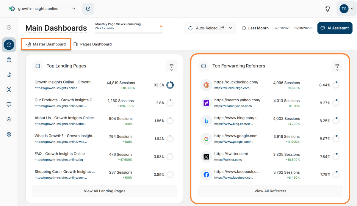 For a deeper dive into page traffic sources, click Show all page's referrer under any listed referrer. This link leads directly to the Referring Websites tab within the Landing & Referrer Pages submodule, offering a comprehensive breakdown. - Direct Page Views: The number of page views generated when visitors accessed the page by typing its URL directly into their browser's address bar during the selected time period.