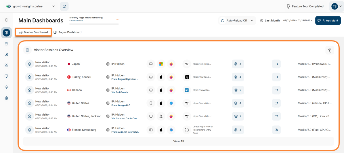 Ready to explore? The dashboard tour is always at your fingertips! Tap the "Start Tour!" or "Feature Tour Completed!" button in the top right corner of the Main Dashboards to get started.