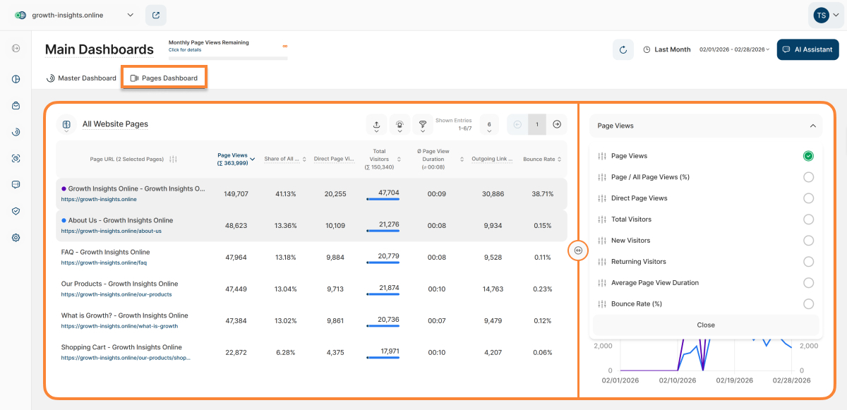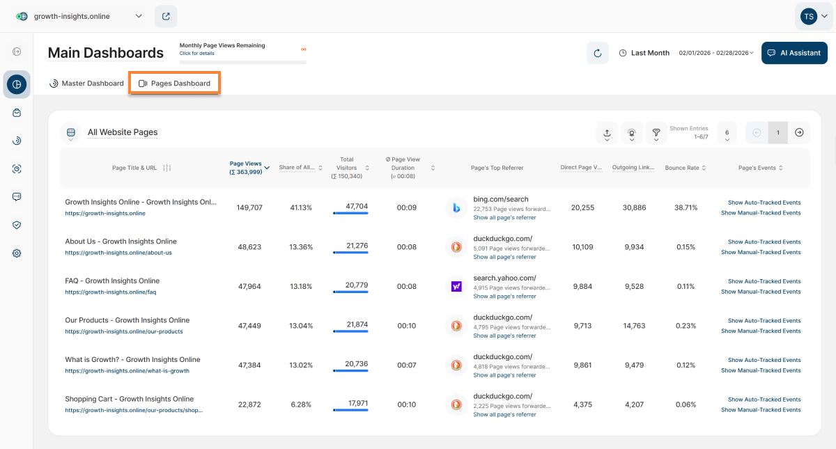 - Pages Dashboard: This section provides you with a thorough overview of your website’s pages and corresponding stats within the selected time period.