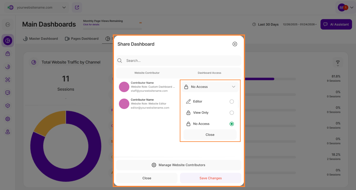 - Website contributors granted Editor access can now edit existing custom dashboards. They can modify dashboard report blocks (RBs), and adjust dashboard filters.