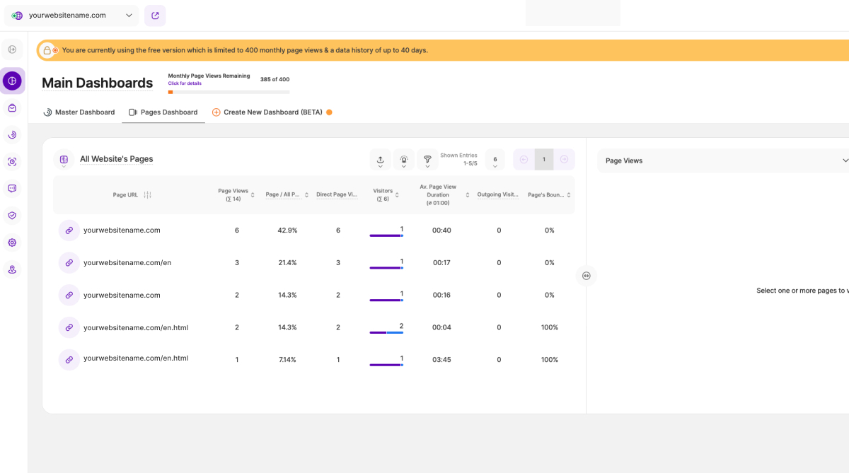 The Pages Dashboard provides an overview of your website's pages, allowing you to analyze various page-specific metrics. It is a valuable tool for website owners and administrators to track and analyze the performance of individual pages and make data-driven decisions to improve the visitor experience and drive desired actions on their website.