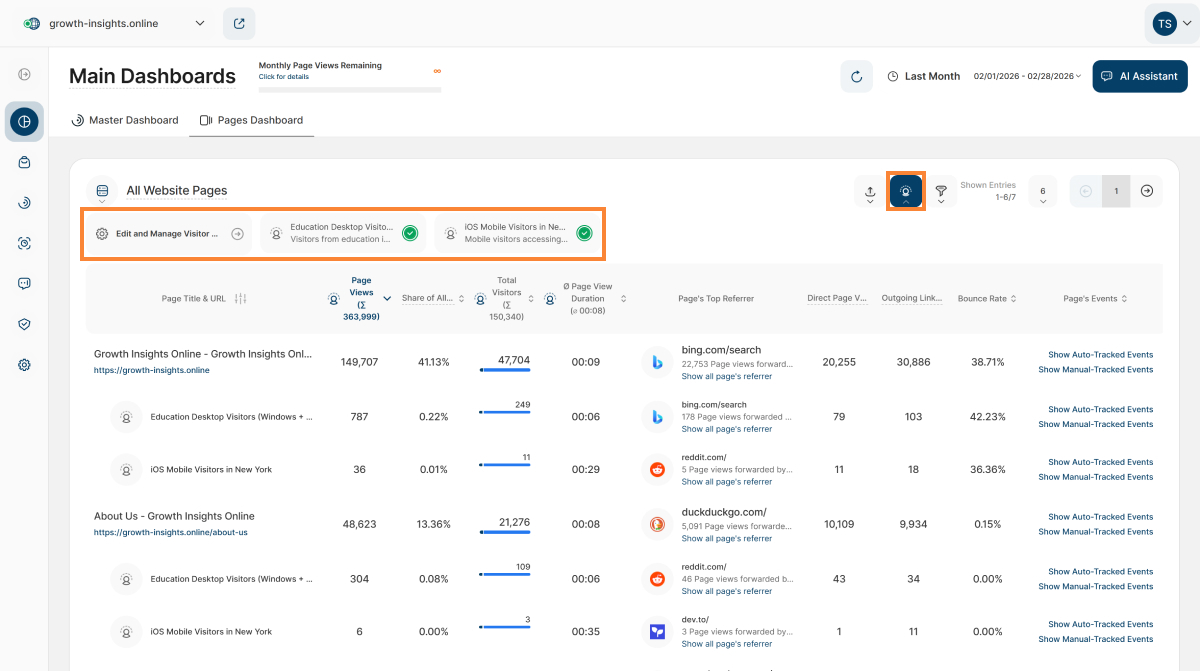 Applying visitor segments helps you analyze specific visitor groups, giving you deeper insights into their behavior. If you haven't created any yet, you can find our full guide on how to create a visitor segment here.