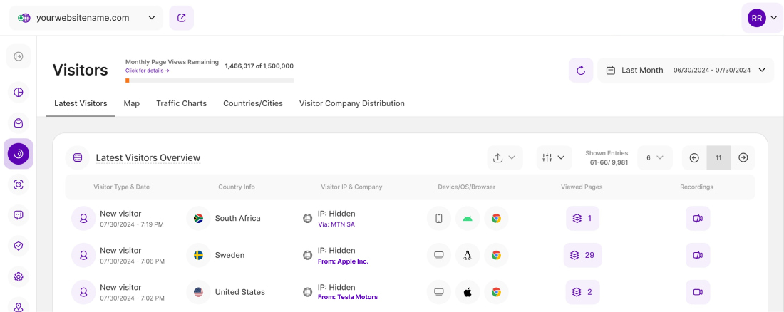 3. Visitor IP & Company: The IP address is a unique string of numbers separated by full stops that identify each computer using the Internet Protocol to communicate over a network. If you are subscribed to the required minimum pricing plan, you'll have access to the Company Reveal feature wherein it examines the visitor IP addresses, cross-references them with company-owned IP ranges, and shows the company name if a match is found; otherwise, it displays the ISP/Carrier Network only.