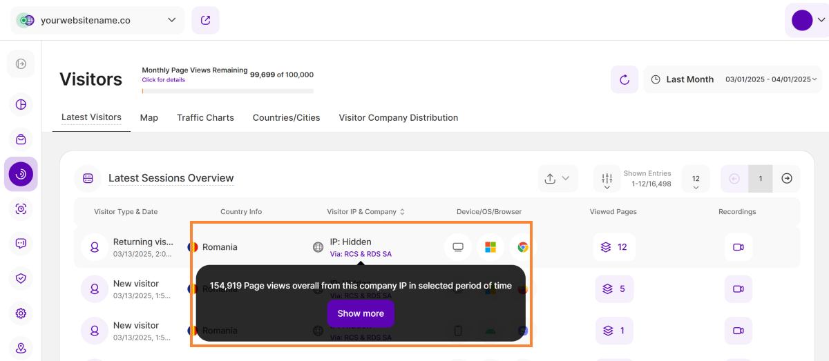 • Hovering over the Company Name or Carrier Network will show a tooltip saying "X Page views overall from this company IP in selected period of time". Clicking "Show More" will lead you to the Visitor Company Distribution tab with more information about the Companies or Carrier Networks via which your website was visited.