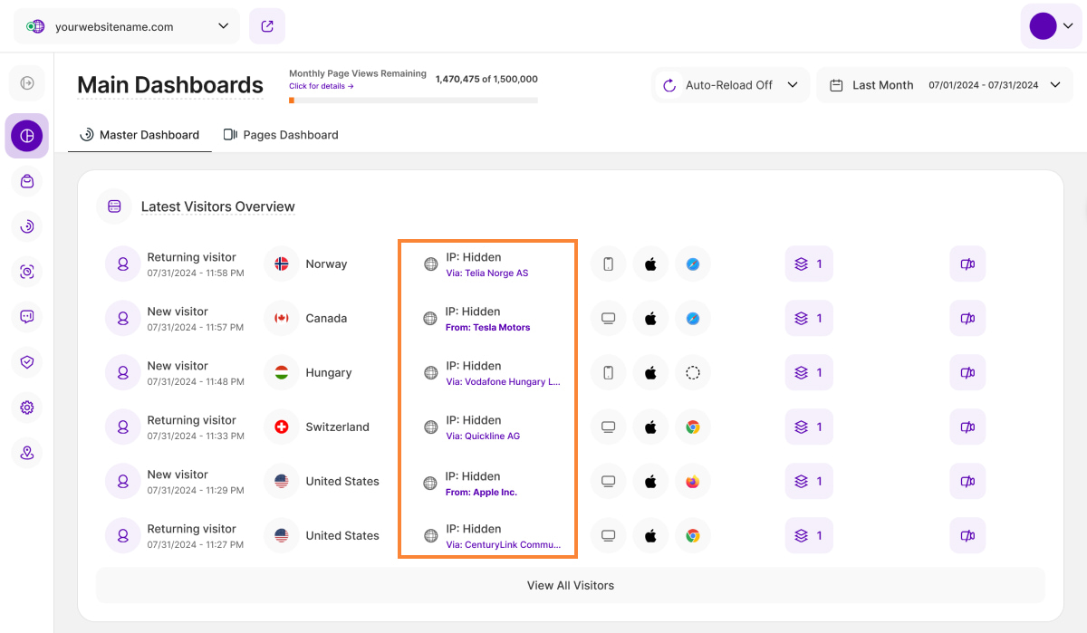 On the Master Dashboard, you'll get a quick overview of the six latest visitors to your website, which includes the following information: