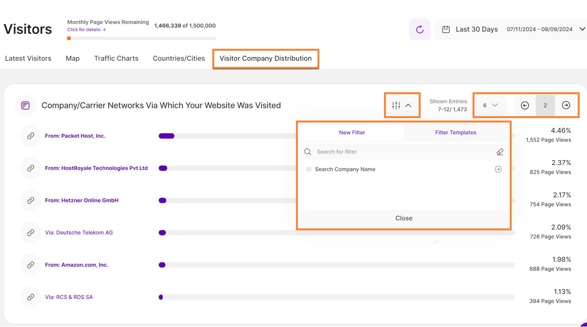 On the Visitors tile, in addition to displaying the IP addresses, company names, or network providers of the visitors who viewed your website, there is a new tab called Visitor Company Distribution. As part of the Company Reveal feature, this tab provides valuable statistics and insights into the companies or carrier networks that contribute the most to the overall traffic on your website. The tab presents this information in the form of a table with bars representing each company or carrier network.